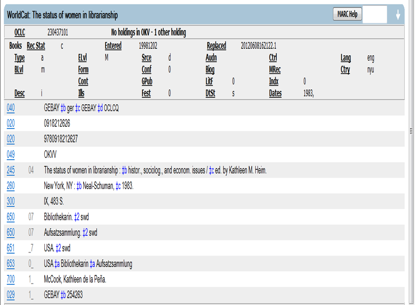 Field 008: fixed-length control field containing coded data describing books (year, type of publication, illustrations, audience, literary form, language, etc.)These fields are seen by catalog users