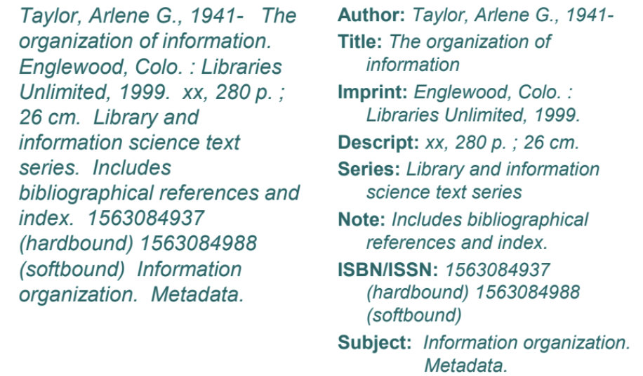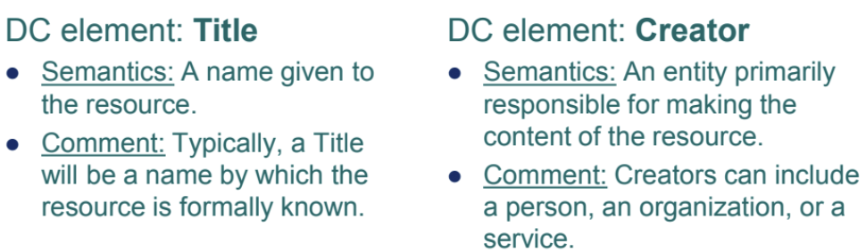 structured information that describes, explain, locates, or otherwise makes it easier to retrieve, use, or manage an information resource” (NISO, 2017:1)metadata elements for title, author, subject, publisher, etcattribute of the objectPurpose: represent an entityFunctions
