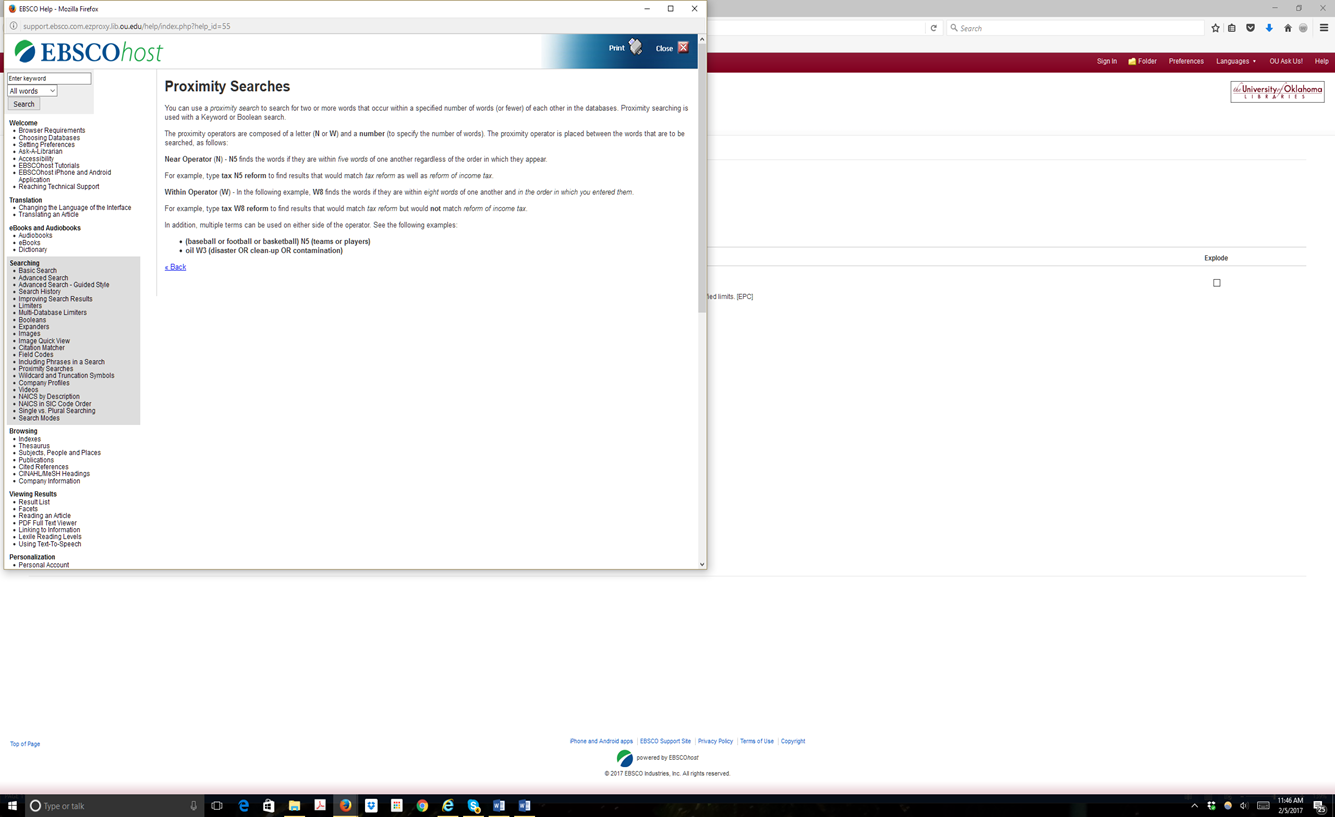 What search features, operators (Boolean, proximity), IR methods (stemming, stopword lists, etc.) are available for the database