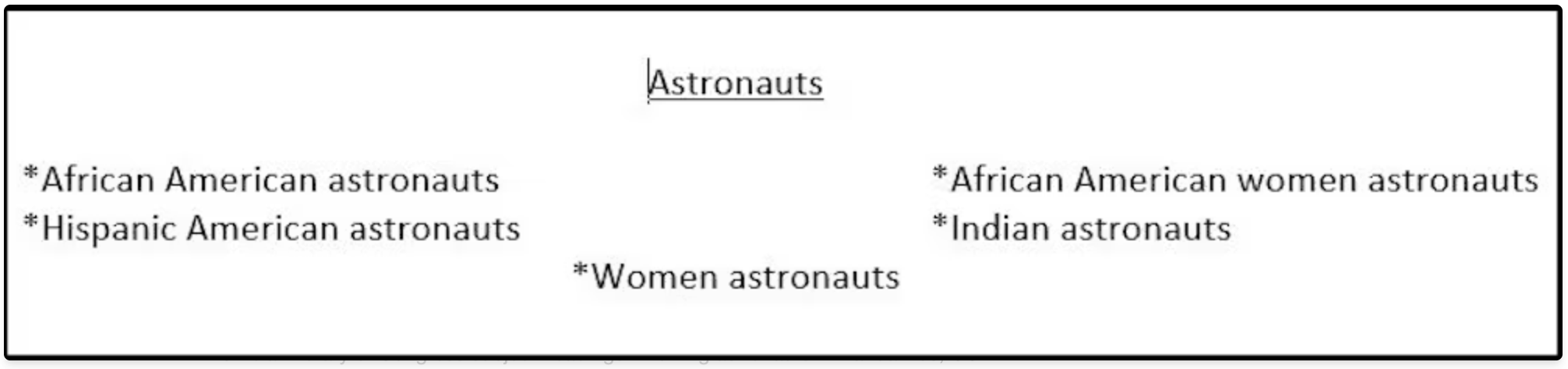 Without gender, race or geographic qualifications, “Astronauts” can be assumed to mean white American men in terms of library subjects