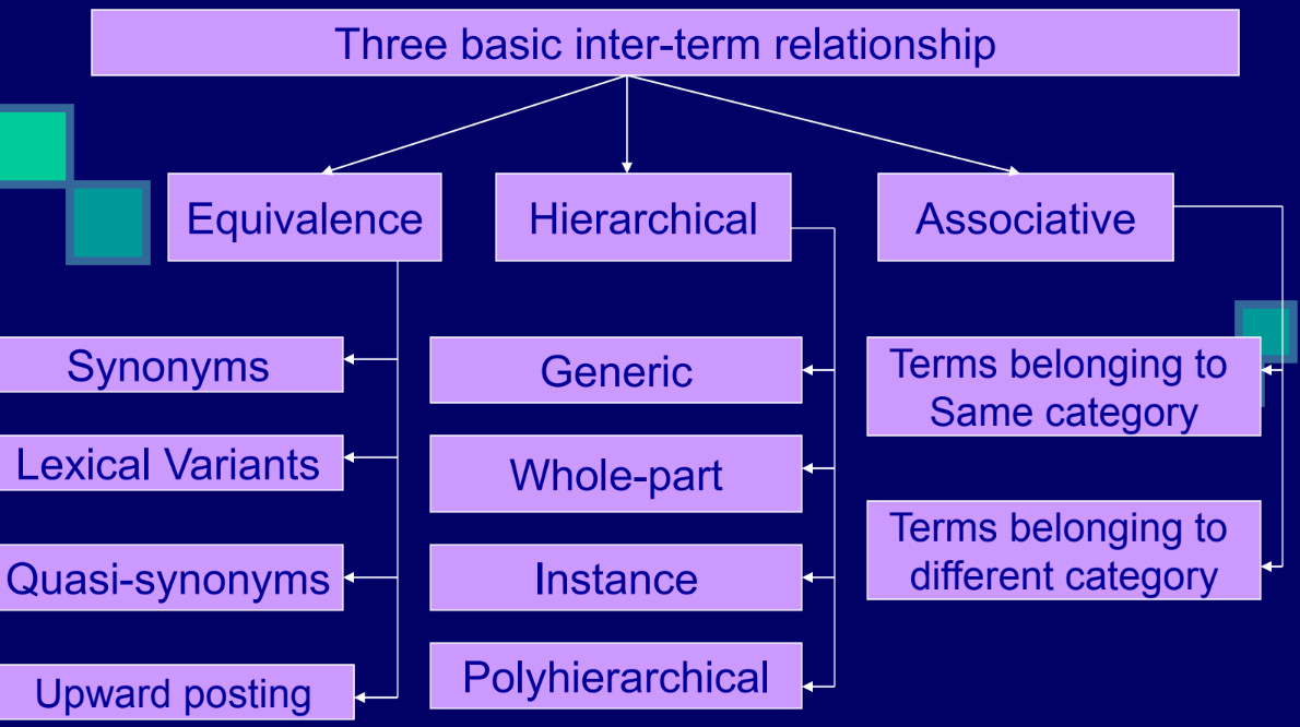 It includes generic relationship, hierarchical whole-part relationship, instance relationship, & polyhierarchical relationship