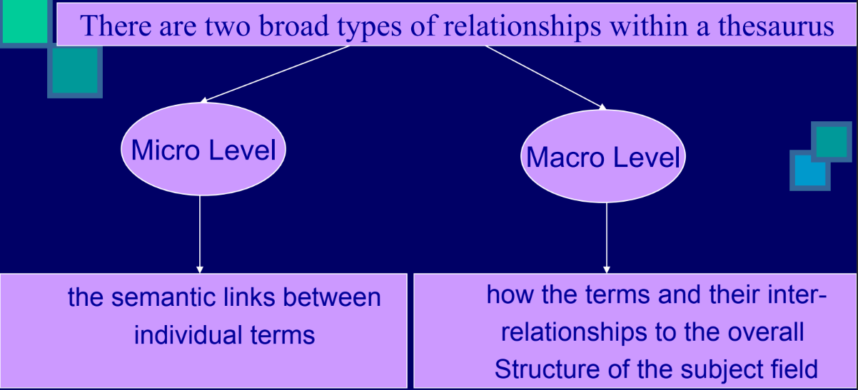 Discuss the need & purpose of a thesaurus in indexing & searching. Discuss with suitable examples, the various types of relationship among the terms in a thesaurus