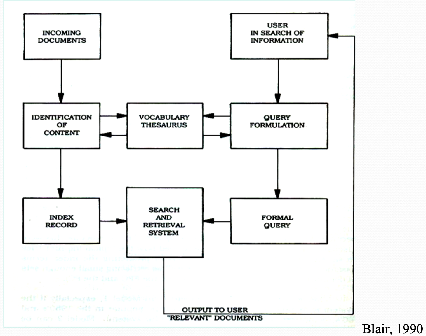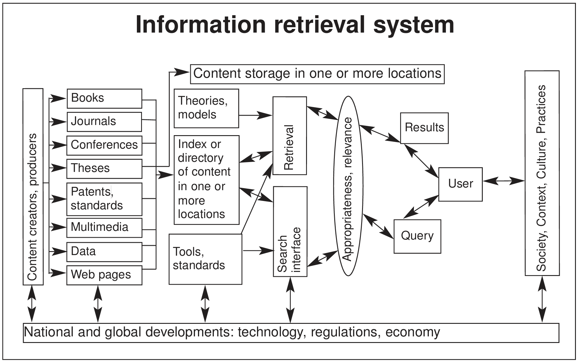 A specialized system for the description, storage, and retrieval of information representations: primarily information objects (text, images) and their surrogates (metadata, records). Operates by matching queries (representations of information need) with data (representations of information objects)